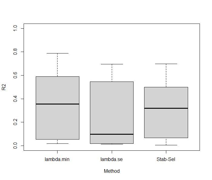 boxplot(cbind(do.call("rbind",results.CV.LASSO), unlist(results.CV.LASSO.SS)), names=c("lambda.min", "lambda.se", "Stab-Sel"), ylim=c(0,1), xlab="Method", ylab="R2")