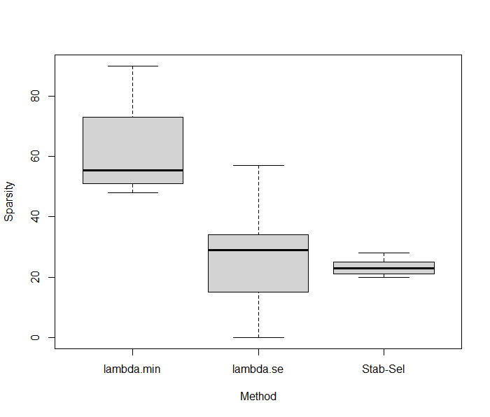boxplot(cbind(do.call("rbind",sparsity.CV.LASSO), unlist(sparsity.CV.LASSO.SS)), names=c("lambda.min", "lambda.se", "Stab-Sel"), xlab="Method", ylab="Sparsity")
